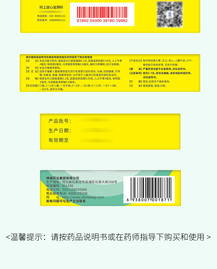 本品为复方制剂,每袋含对乙酰氨基酚0.1克,盐酸金刚烷胺0.04克,人工牛黄4毫克,咖啡因6毫克,马来酸氯苯那敏0.8毫克。