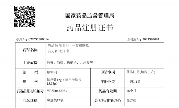 2023年12月26日,由星空电竞药业全面负责技术研究和注册申报的3.1类古代经典名方中药复方制剂一贯煎颗粒获批上市,星空电竞药业为首个获得该品种的上市许可持有人。
