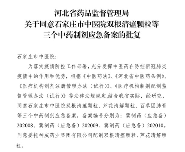 文件指出,为落实疫情防控工作部署,充分发挥中医药在防控新冠肺炎疫情中的作用和优势,依据相关法律法规规定同意双根清瘟颗粒等三个中药制剂应急备案并应用于新冠肺炎治疗。这三款中药制剂可在河北省防控新冠肺炎的定点医院、发热门诊、预检分诊点、集中隔离点,以及其他防控工作需要的单位等调剂使用。