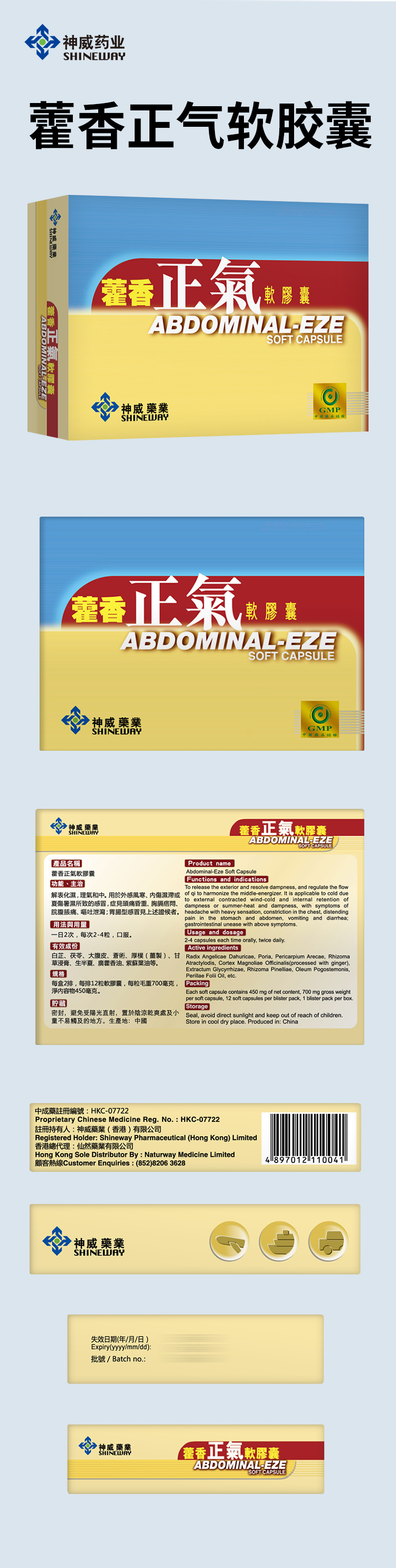 - 苍术、陈皮、厚朴(姜制)、白芷、茯苓、大腹皮、生半夏、甘草浸膏、广藿香油、紫苏叶油。辅料为明胶、甘油、巧克力棕、苋菜红、精制玉米油、大豆磷脂、蜂蜡。