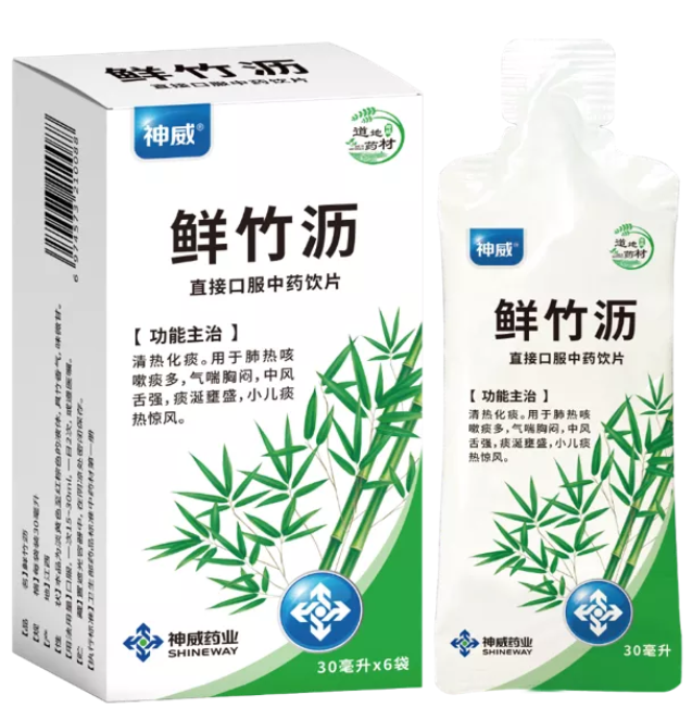 鲜竹沥为竹子鲜杆经加热后自然沥出的液体,具竹香气,味微甘,具有清热化痰的功效,用于肺热咳嗽痰多、气喘胸闷、中风舌强、痰涎壅盛、小儿痰热惊风,尤其对小儿感冒咳嗽效果显著,是不可多得的绿色纯天然中药。在中国古代,竹沥被中医誉为“痰家圣剂”。现代药理学研究发现,鲜竹沥中含天冬氨酸、蛋氨酸、丝氨酸、脯氨酸等多种成分,具有镇咳、祛痰、平喘、抗菌消炎等作用。